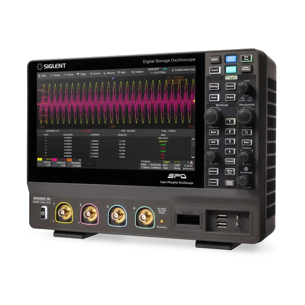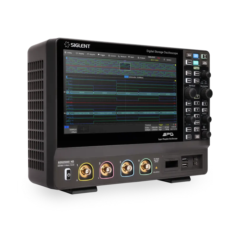 The SDS2204X HD uses SIGLENT's SPO technology with a maximum signal acquisition rate of up to 100,000 wfm/s in normal mode and up to 500,000 wfm/s in sequence mode, a 256-level intensity display function, and a "color temperature" display. It also features an innovative digital trigger system with high sensitivity and low jitter. The trigger system supports a variety of advanced trigger modes including serial bus trigger. Tools such as signal history recording, search and navigation functions, mask check, Bode Plot, Power Analysis, and Histogram allow the capture, storage, and analysis of extended signal sequences. In addition, the SDS2204X HD offers a wide range of measurement capabilities and mathematical operations, an option for a 25MHz arbitrary waveform generator, as well as serial decoding.